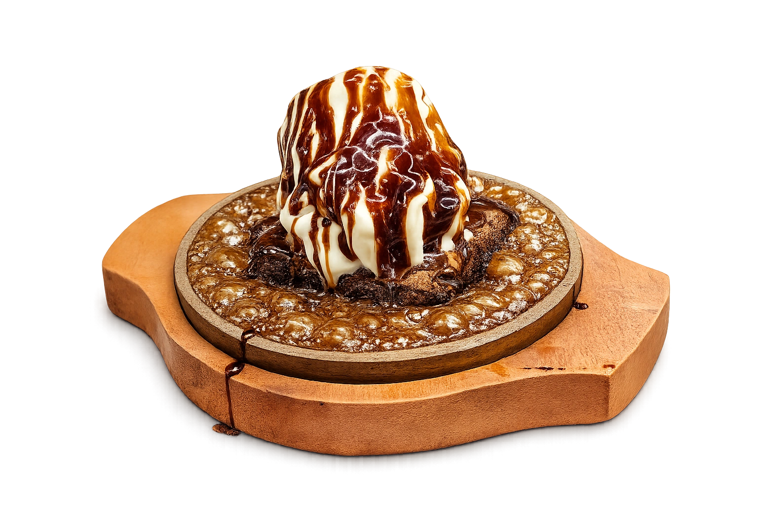 Experience the rich aroma of hot chocolate brownie served on a sizzling plate with melting vanilla ice cream.